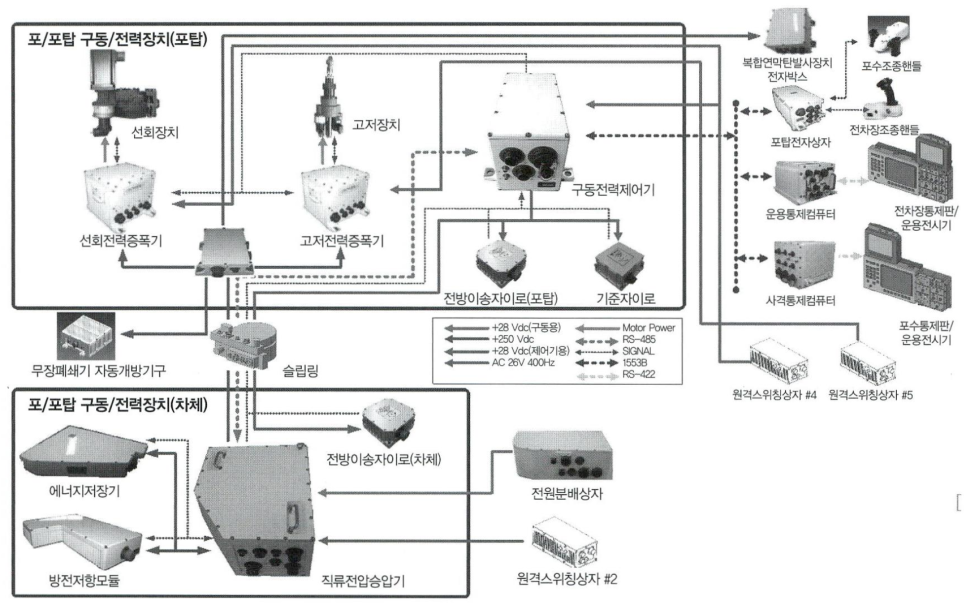 주포 자동고정장치는 자동고정장치 및 제어기로 구성이 되며, 솔레노이드 형식으로 승압기로부터 260Vdc 구동 전원을 공급받아 장전 시 주포를 고정하여 주는 역할을 수행한다. 주포 자동고정장치 제어기는 포/포탑 구동용 제어기와 연결되어 장전각 이동 시 포/포탑 구동용 제어기의 동작 신호를 받아 고전압 분배기로부터 인입된 260Vdc의 구동 전원을 주포 자동고정장치에 전달 및 해제시켜 주는 역할을 수행한다.