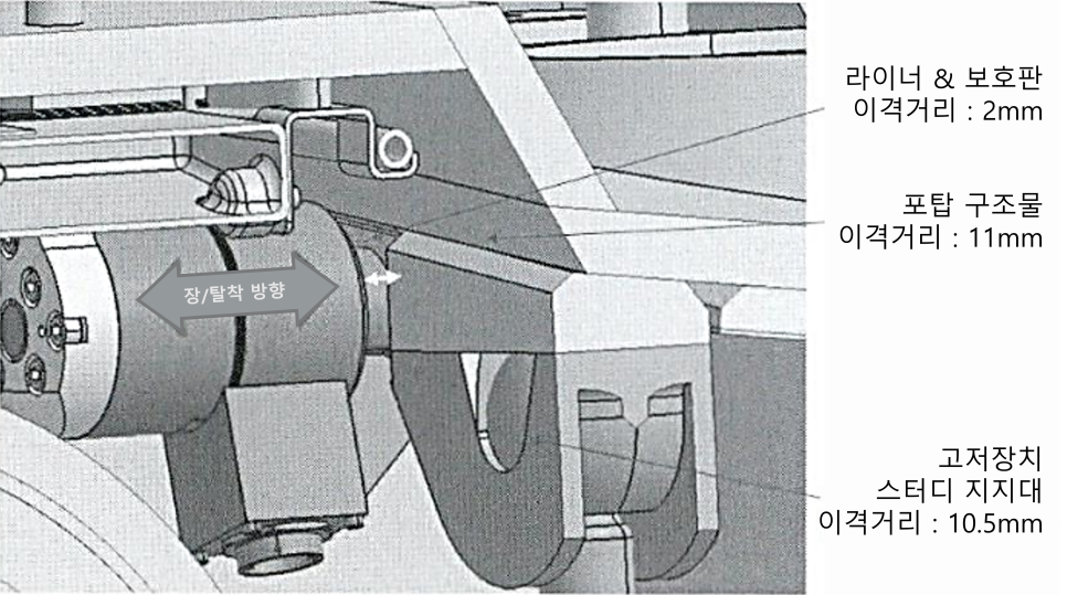 주포 자동고정장치의 장 - 탈착을 원활하게 수행하기 위해서는 최소 구조물과의 이격거리가 25mm 이상이어야 하나, 현 설계는 구조물과 10.5mm, 차폐라이너 및 보호판과 2mm 내외의 이격거리로 되어 있어 설치 및 정비에 어려움이 있었다. 이를 해소하기 위해 주포 자동고정장치를 약 20mm 정도 축소 수정하여 장착판과 주포 자동고정장치 의 이격 거리를 확보하고자 하였으나, 주포 자동고정장치의 성능 저하 가능성에 대한 우려가 발생되었다.